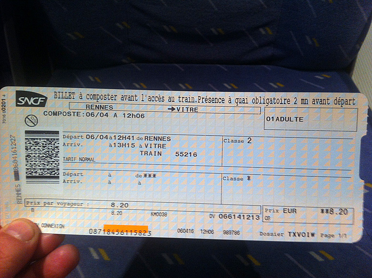 En Rennes hemos tomado el metro para irnos a la estación de tren. Ese endemoniado artilugio que ellos denominan metro es una especie de «trenecillo bala» en el que hay que ir bien agarradito porque acelera como un fórmula 1. Cuesta 1,50€.